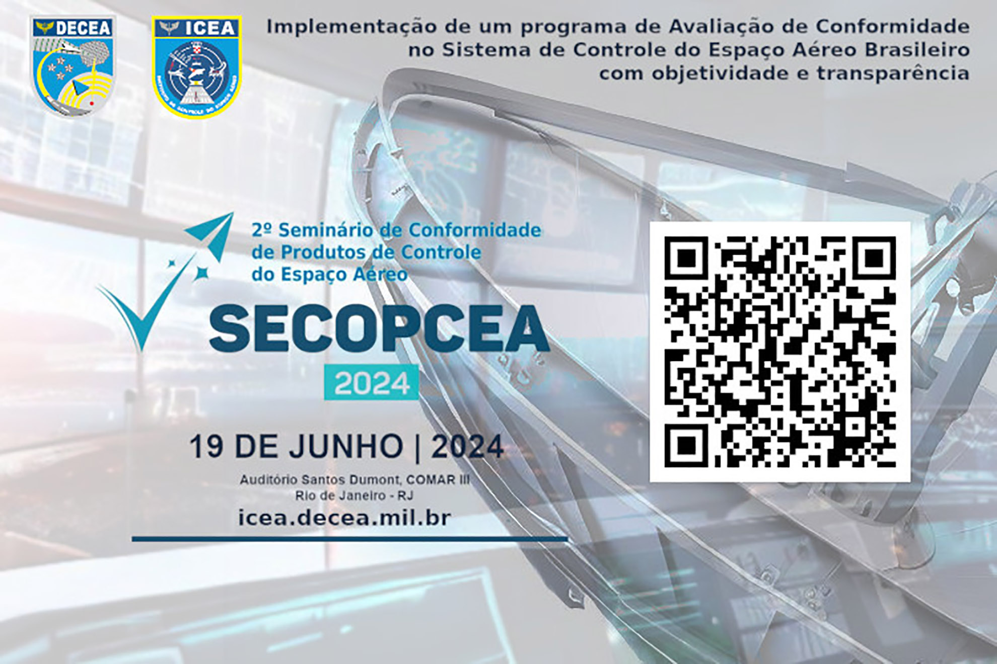 O Departamento de Controle do Espaço Aéreo (DECEA) promove, em parceria com o Instituto de Controle do Espaço Aéreo (ICEA), o 2º Seminário de Conformidade de Produtos de Controle do Espaço Aéreo (SECOPCEA). O evento será realizado no Rio de Janeiro, 19 de junho, e tem por objetivo disseminar, de forma transparente e coordenada, as devidas ações na implementação da Avaliação de Conformidade no âmbito do Sistema de Controle do Espaço Aéreo Brasileiro (SISCEAB).
